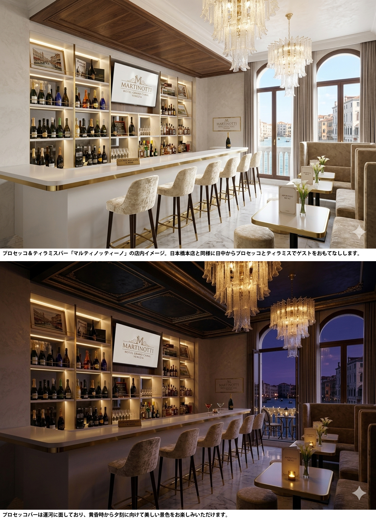 出店先は、ヴェネツィアの運河を望む名門ホテル「GOOSIX PALAZZO GRANDE」(ゴーシックス パラッツォ グランデ)の1階。日本橋で培った「プロセッコのある日常」というコンセプトを維持しながら、現地ホテルの格調高い雰囲気に合わせたエレガントなラウンジスタイルを展開します。