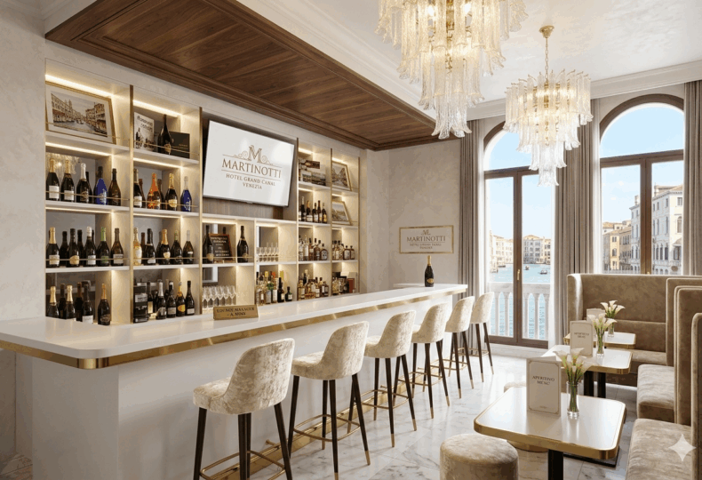 出店先は、ヴェネツィアの運河を望む名門ホテル「GOOSIX PALAZZO GRANDE」(ゴーシックス パラッツォ グランデ)の1階。日本橋で培った「プロセッコのある日常」というコンセプトを維持しながら、現地ホテルの格調高い雰囲気に合わせたエレガントなラウンジスタイルを展開します。